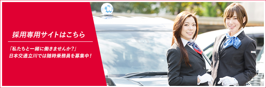 私たちは、日本交通立川です。 信頼のNo.1ブランド 「日本交通」の100%子会社です。 地域の足として半世紀 無くてはならない交通機関としての誇り。 これからも、もっと愛される存在に。 タクシーは、もっともっと快適に・ 先進のタクシーサービスをあなたへ。 「移動」はもっと素敵になります。 「私たちと一緒に働きませんか?」日本交通立川では随時乗務員を募集中!まずは説明会だけでもOK! 求人に応募する 業界最大手!日本交通の子会社です。 日本交通立川株式会社は、業界最大手である日本交通株式会社の100%子会社です。北多摩地域に91台の車両台数を揃え、「桜にN」の快適さを皆様にお届けします。 多摩エリア「接客No.1」を目指しています! 私たちの目標は、新しい時代にふさわしい「高品質なタクシーサービス」の提供。「桜にN」ブランドの高い接客力で、お客様から信頼される交通機関を目指します。 日本交通立川なら、仕事もプライベートも充実 日本交通立川は、規則的な勤務シフトを採用していますので、無理なく働けます。野球・ボウリング・釣り・ゴルフといったサークル活動も盛んです。きっと仕事だけでなくプライベートも充実できることでしょう! 笑顔のすてきな人、求めてます。 タクシー業を接客業だと感じているあなた。タクシーのイメージを私達と一緒に変えて行きませんか?男性はもちろん女性でも、笑顔に自信があるあなたをお待ちしております。 アクセス JR立川駅南口 バス10分「富士見町団地」バス停下車 facebookページもチェック!