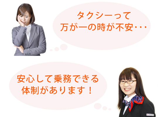 例えば、防犯用に車内カメラを設置していますので、安心して乗務することが可能です。また、万が一のときにも、緊急通報システムで無線配車センターに通知され安全確保に努めます。